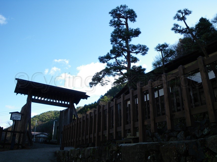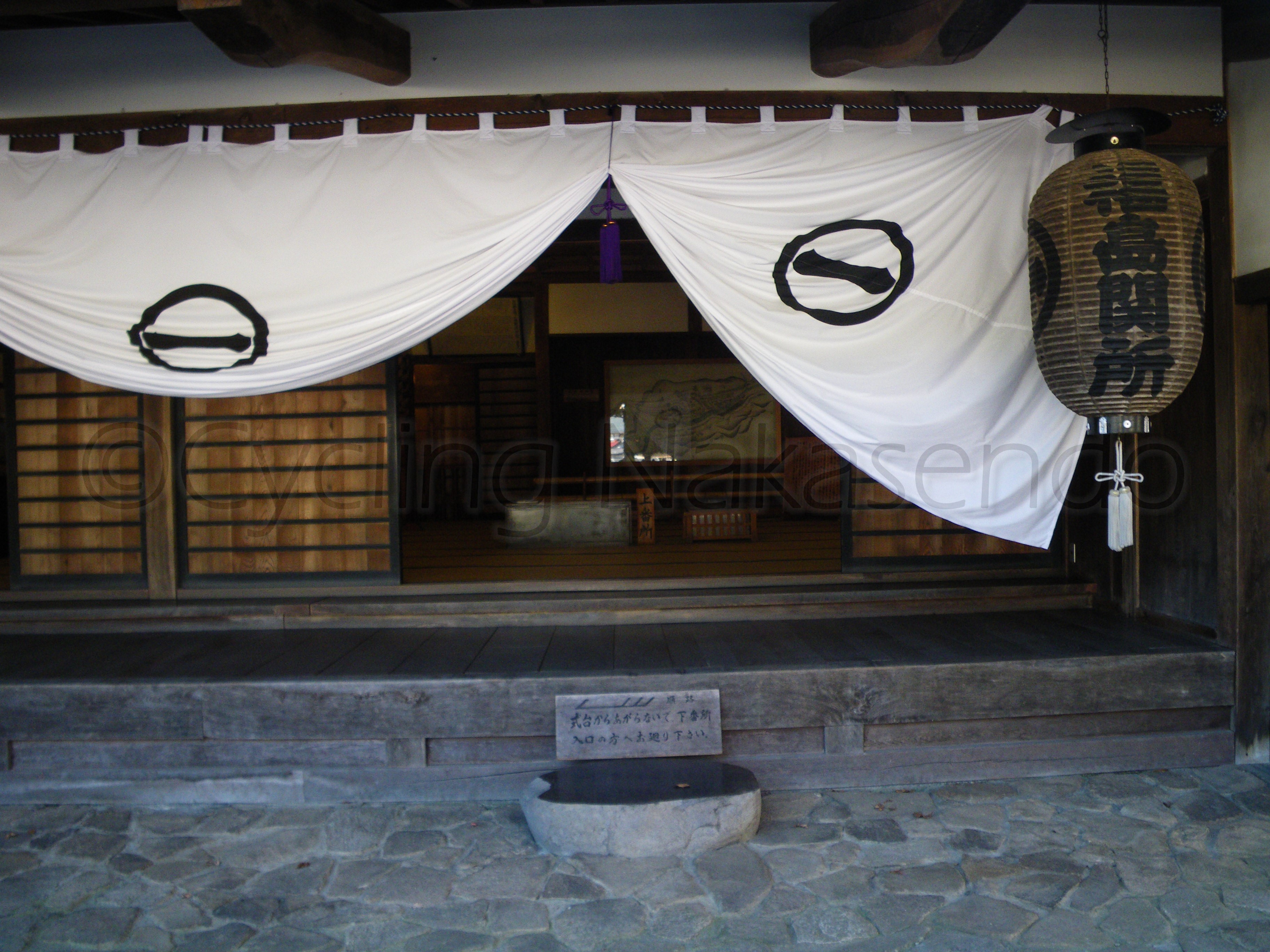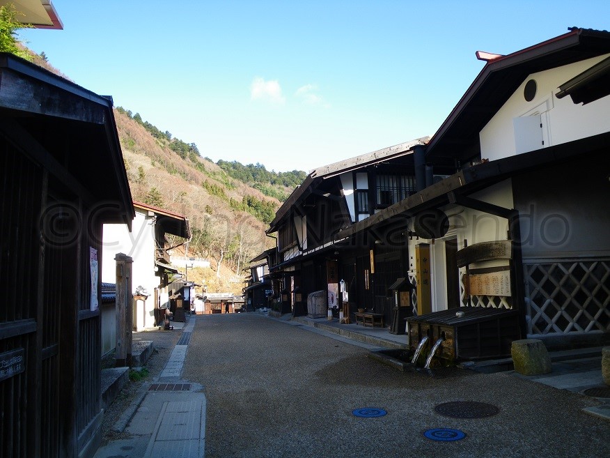 The name Kiso-fukushima originated from the original name of the post town, Fukushima. Kiso was added later to distinguish the region from others as there are many locations called Fukushima in Japan. The road between the train station and Tsutaya actually traces Nakasendo, which begins with a short downhill two-lane community road. As it continues it passes local shops, banks, local inns and a soba noodle restaurant. Nakasendo continues straight whereas the two-lane road diverts left towards Kiso River. We stayed on Nakasendo. A bridge appeared on the left as we passed rows of Japanese style houses on either side of the narrow street. The street is paved in a yellowish sandy colour from the bridge and continues for several sections of road within consecutive masugatas. It is just 270 m in length, but has a charming atmosphere with very nicely restored old buildings lining the street. At the center of it is a paved stream where clear water has flowed continuously for more than 800 years. As we continued on Nakasendo the street became a downward slope where we made a right turn at the restored kosatsuba and from there the route veered to the left and leveled off as we passed a local sake brewery. We came to a narrow passage, which ended up joining the widened road after turning right. The street along the next section of Nakasendo looks like a regional Japanese town would have 30 years ago. At this point we came across a set of traffic lights, which seemed like the first ones we had seen in ages.
