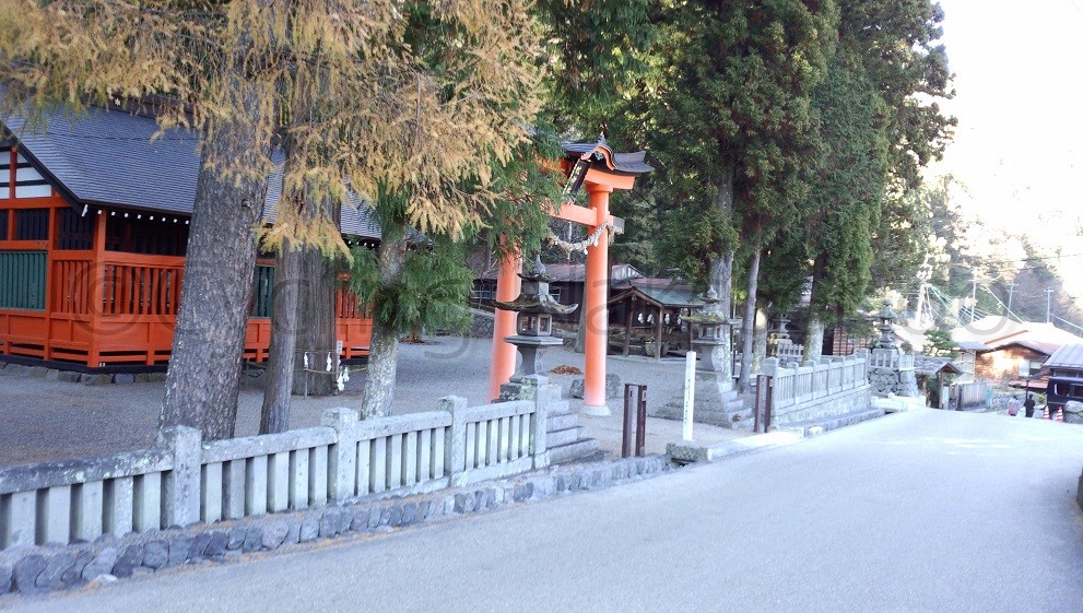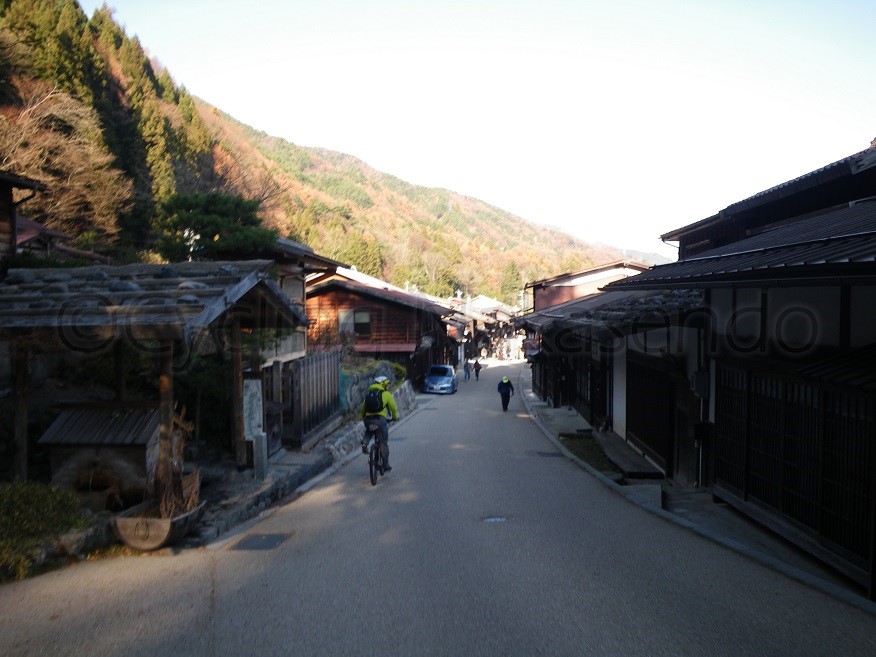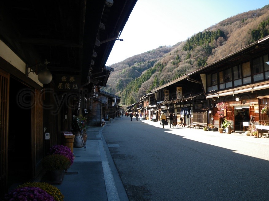 Descending from Shizume Shrine into Narai-juku where restored kosatsuba stands on the left