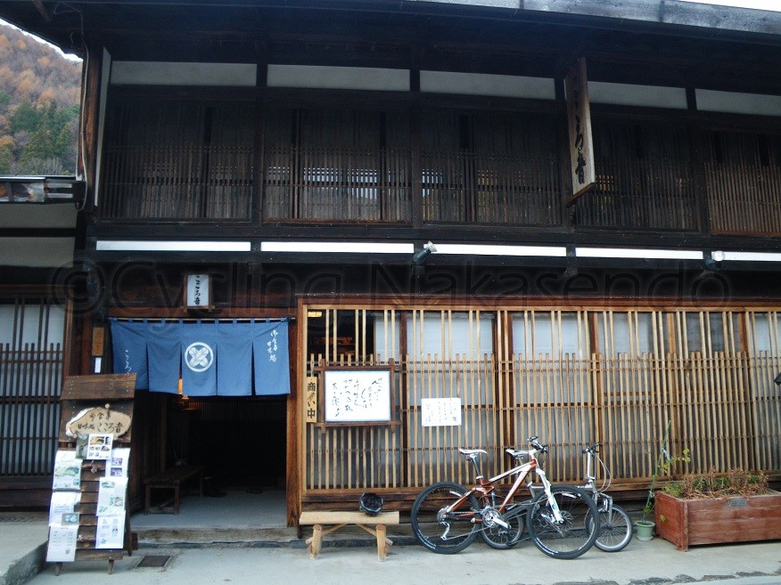 We left the center of the town and headed towards a place I always stay at in Narai, called Ikariya Machida Minshuku. We passed by its front, which is distinctive due to its narrow façade and a doorway that you couldn’t pass the handles of a bike through. Nearby an electrical goods store is run from a traditional building with a retro sign out the front. The effective use of something old in a way that is contemporary has created a good atmosphere. There are very few convenience stores along Kisoji, so places that supply batteries and other electrical goods are highly valued. While we had enough batteries, we were both drained after the bear panic and needed to attend to our body’s energy reserves so we decided to look for somewhere to eat when we realized we had ridden to the edge of the Edo side of the town. We headed back into the center of town.