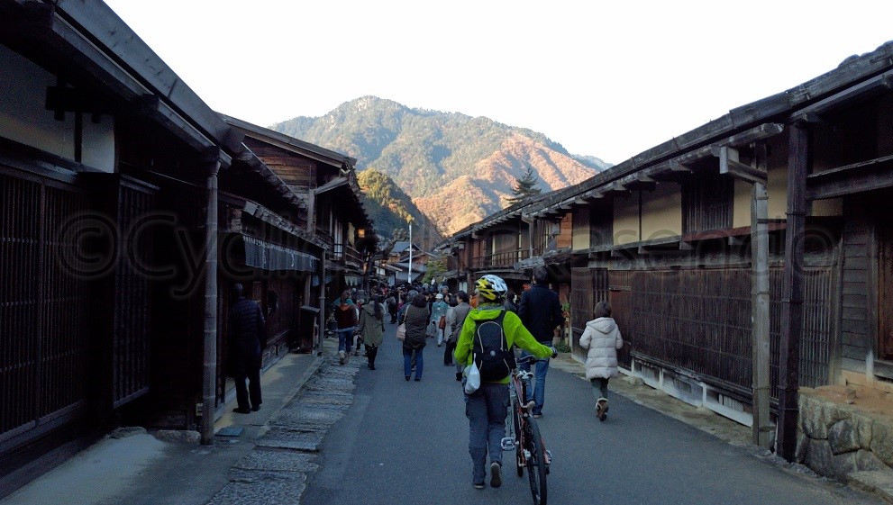 We reached a sign at the outer boundary of the center of Tsumago that indicated riding was not allowed further in the town. We got off our bikes to comply with the sign and headed into the center of Tsumago. Eventually we reached rows of buildings on both sides of the street that were filled with people. The density of tourists was surprisingly higher than I expected. The crowd was like you find in a shopping street in Tokyo. During the Edo era this area was known to be an economic hub however it seemed insanely busy and I found myself wondering if it was the busiest day the street had seen since the town was established. Now it is a shopping street selling local crafts, tea, sweets and souvenirs for tourists in historical buildings. It is truly an achievement to restore and preserve an entire post town to this level. The result of this is that Tsumago and Otsumago have collectively become Japan’s first Nationally-designated Architectural Preservation Site. The route resumes with stairs from the foot of the Kotokuji Temple and continues through the Terashita (under the temple) district.