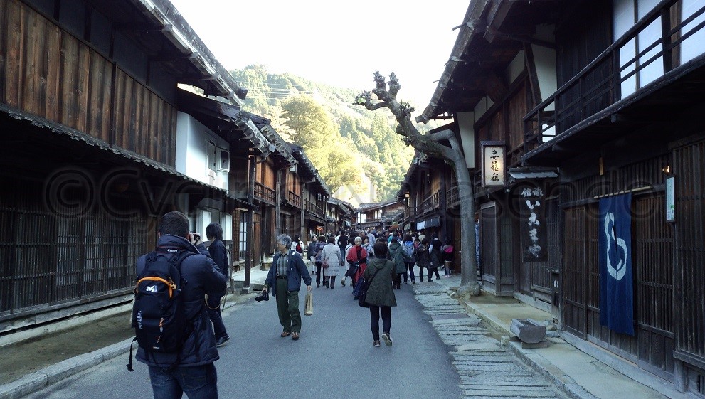 Very busy with tourists on sunny autumn Saturday in Tsumago-juku